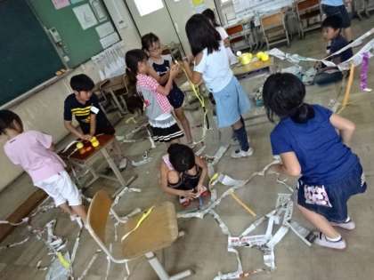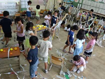 子どもたちは,紙をつないで道をたくさんつくったり,紙をつるして「こいのぼり」「つらら」などをつくったりしていました。