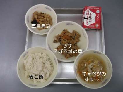 今日の献立は,『麦ご飯』『キャベツのすまし汁』『五目煮豆』『ツナそぼろ丼の具』『牛乳』です。