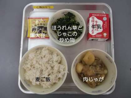 今日の献立は,『麦ご飯』『肉じゃが』『黒大豆』『ほうれん草とじゃこの炒め物』『牛乳』です。