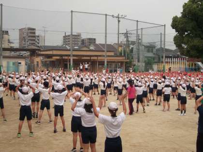 『全校ダンス』は,準備体操として,全校児童みんなで踊ります。6年生のダンス係の動きをよく見ながら,どの子も楽しそうに踊っていました。