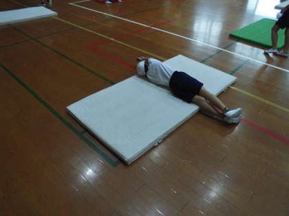 その後,「えんぴつ」や「ゆりかご」「かわわたり」など,マットを使った体ほぐしの運動を行いました。