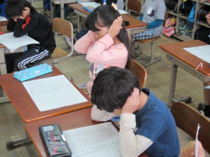 算数の時間には,限られた時間内に真剣に覚えようと,耳をふさいで自分の声を聞きながらくり返し練習していました。
