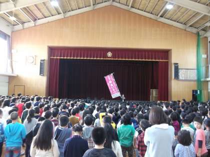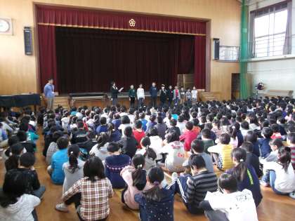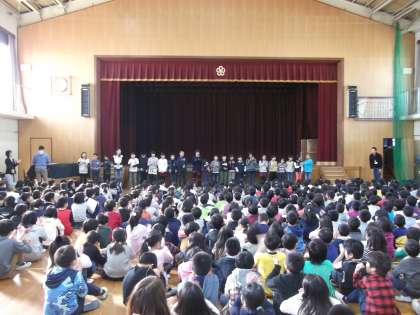また,「発明協会コンクール学校賞」「バレーボール全市交流会」「姉妹都市作品コンテスト」で優秀な成績を収めた子どもたちに表彰状が贈られました。全校児童で,がんばりを称えました。