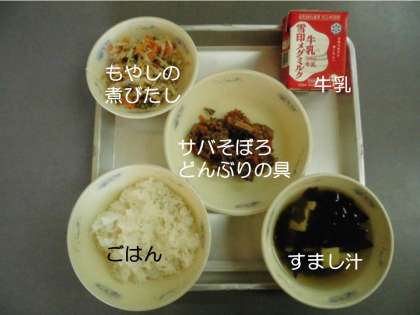 今日の献立は,『ごはん』『すまし汁』『サバそぼろどんぶりの具』『もやしの煮びたし』『牛乳』です。