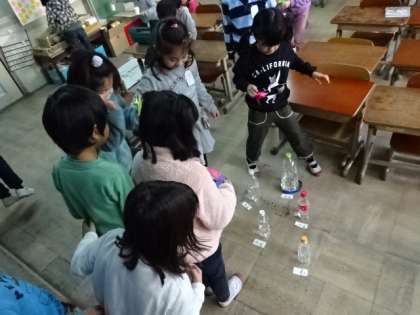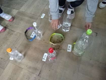 投げる場所からの距離や,ペットボトルの大きさで点数を変えながら,みんなが楽しめるようにルールを考えていました。輪を1つ投げるたびに「おお!」と歓声があがって,にこにこと笑顔になっていました。