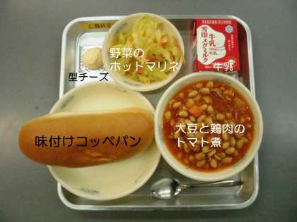 今日の献立は,『味付けコッペパン』『大豆と鶏肉のトマト煮』『野菜のホットマリネ』『型チーズ』『牛乳』です。