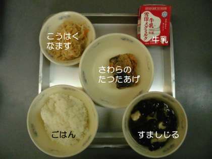 今日の献立は,『鰆の竜田揚げ』『紅白なます』『すまし汁』『ごはん』『牛乳』です。