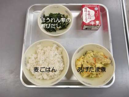 今日の献立は,『麦ごはん』『あげたま煮』『ほうれん草の煮びたし』『牛乳』です。