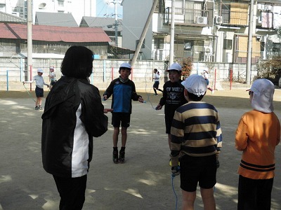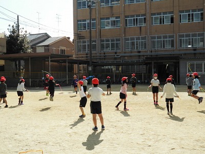 今週の月曜日の朝会で,体育委員会のお兄さんお姉さんが,なわとびの色々な跳び方を教えてくれたので,その跳び方に挑戦していました。