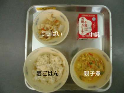 今日の献立は,『親子煮』『てっぱい』『麦ごはん』『牛乳』でした。