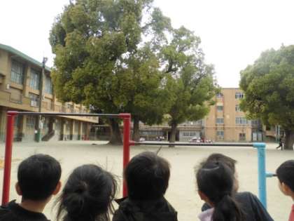 校舎の外を探検に行ったクラスは,運動場にいろいろな遊具や大きなくすのきがあったり,中庭にたくさんのきれいな花が咲いていることを発見していました。