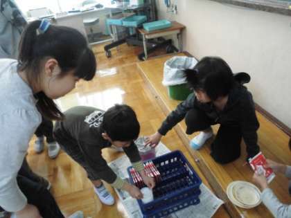 1年生は初めての給食です。そこで,6年生が手伝いをしにいくことにしました。