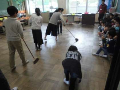 今日は,1年生が5時間目まで学習したので,6年生は掃除の仕方のお手本を1年生に示していました。