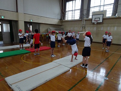 マット運動の学習で,とび前転や開脚前転,開脚好転などの技に挑戦しています。