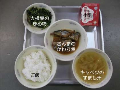 今日の献立は,『ご飯』『キャベツのすまし汁』『大根葉の炒め物』『さんまのかわり煮』『牛乳』です。