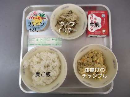 今日の献立は,『麦ご飯』『油揚げのチャンプル』『パインゼリー』『クーブイリチー』『牛乳』です。