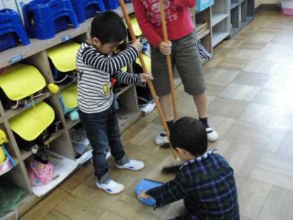 机は重いので二人で運んだり,ちりとり役とほうき役に分かれてゴミを拾ったり,協力して行っています。また,大きな雑巾を小さな手で一生懸命にしぼり,床ふきをしたりしています。