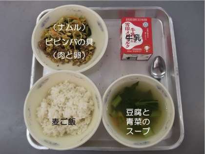 今日の献立は,『麦ご飯』『豆腐と青菜のスープ』『ビビンバの具(ナムル)(肉と卵)』『牛乳』です。