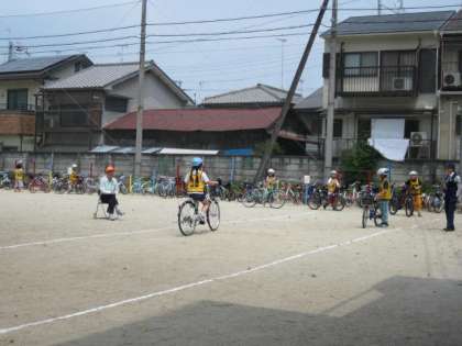朝から少し湿度の高さを感じるようなお天気でしたが,下京署の方やたくさんの地域の方のお世話になり,4年生の児童が自転車教室に参加しました。