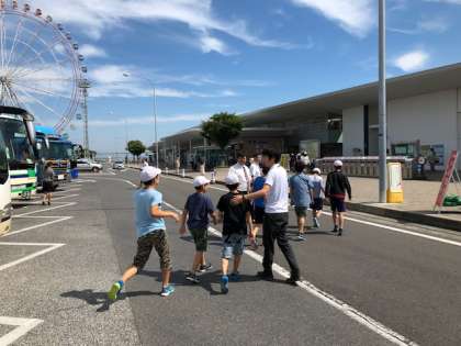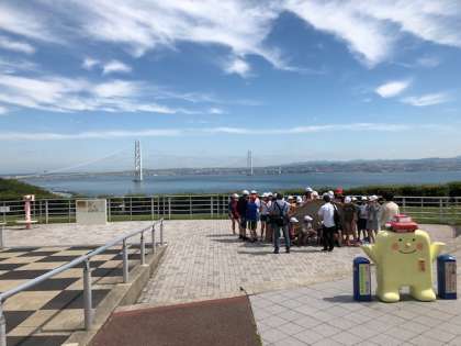 明石海峡大橋を背景に記念撮影をしています。このあとは,吹き戻しの里を目指して,バスに乗車します。