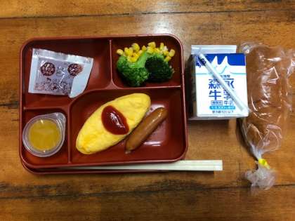 朝食を食べました。メニューは,パン・オムレツ・ソーセージ・サラダ・ゼリーに牛乳でした。おいしくいただきました。