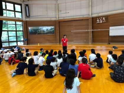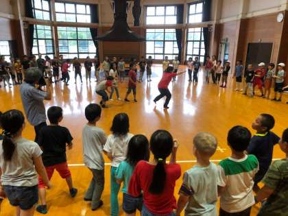 昼食後,午後の活動は磯観察の予定でしたが,雨のためプレイホールでゲーム大会をしています。