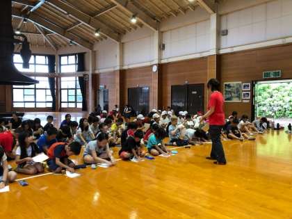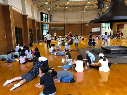 最後のゲームは,「作文パーティーゲーム」です。考えているようす。子どもたちも広いプレイホールで,ゆったりしながら,楽しんでいます。