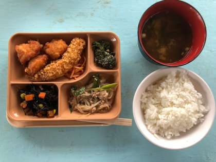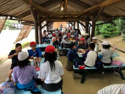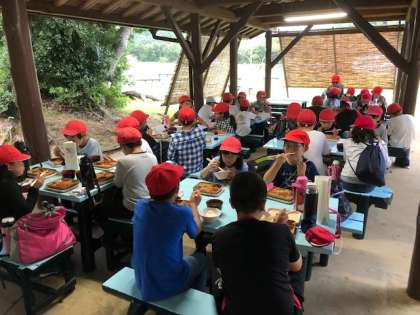 夕食の様子です。今日は,いろいろな活動をしたのでお腹が減っているでしょう。この後は,みんなが楽しみにしているキャンプファイヤーです。