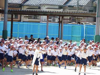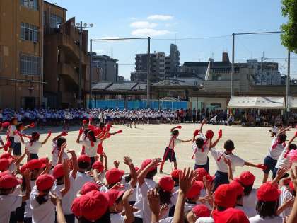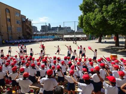 運動会に向けて練習を重ねてきた「ゴーゴーゴー」歌。赤,白,全員の順で歌うと運動場に響いて,力がみなぎってきます。