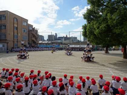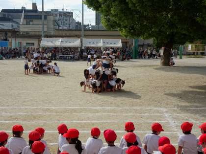円陣を組み,掛け声とともに,タワーができていきます。運動場に大きな大きな拍手が鳴り響きました。
