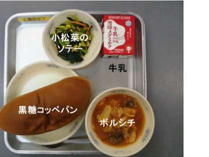 今日の献立は,『小松菜のソテー』『ボルシチ』『黒糖コッペパン』『牛乳』でした。