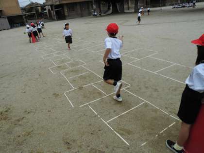 初めは,ルールの確認のためにも直線でゲームをしました。すぐに慣れたようなので,走るコースを「くねくね」「ジグザグ」「ケンケンパ」の3つにレベルアップしました。
