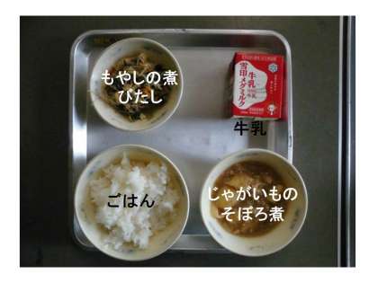 今日の給食の献立は,『もやしの煮びたし』『じゃがいものそぼろ煮』『ごはん』『牛乳』でした。