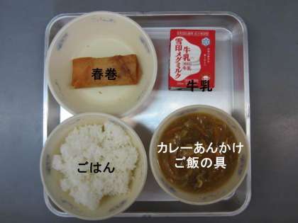 今日の献立は,『春巻』『カレーあんかけご飯の具』『ごはん』『牛乳』でした。