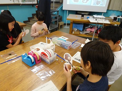 『モノづくりの工房』では,振動を加えると電気が生まれる特別な金属を使って,目が光るたぬきの工作に取り組みました。