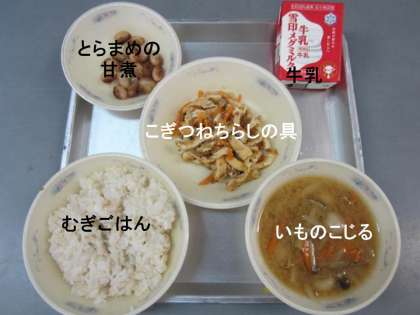 今日の献立は,『とらまめの甘煮』『こぎつねちらしの具』『いものこ汁』『むぎごはん』『牛乳』でした。