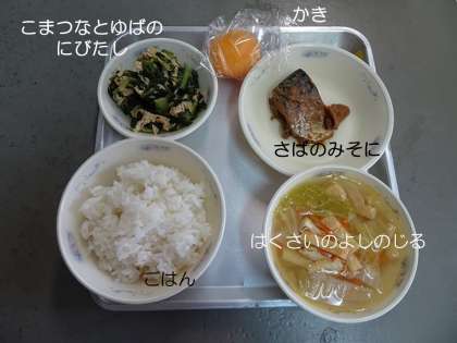 今日の給食は,『ごはん』『はくさいのよしのじる』『さばのみそに』『こまつなとゆばのにびたし』です。和(なごみ)献立として,秋の味覚を楽しみます。