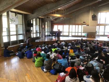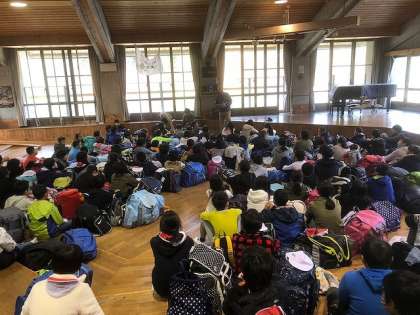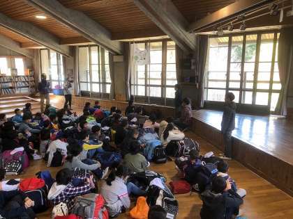さっそく入所式をしました。所員の方のお話を聞いて,いよいよ山の家での活動が始まります。