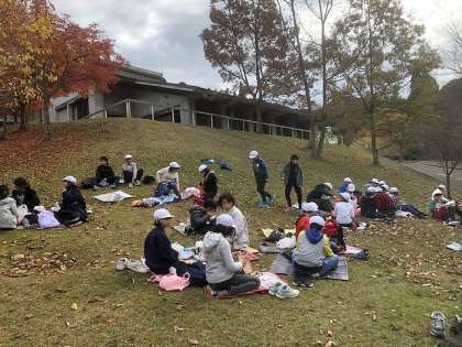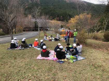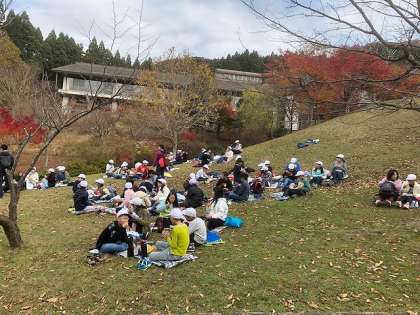 入所式の後は,みんなで昼食です。午後からの活動に備えて水車小屋近くの芝生広場でお弁当を食べました。花背は,もうすっかり秋模様です。