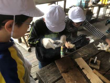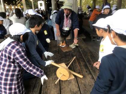 説明を聞いたあとは,さっそく火おこしにチャレンジ。