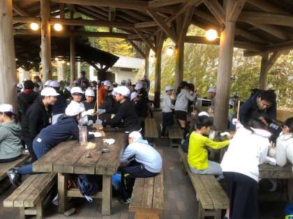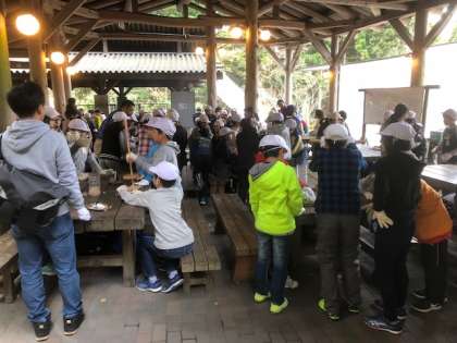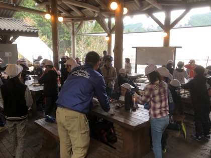 1日目のめあては,協力。グループで声をかけあって連携できたかな。ほぼ全ての班が,火起こし器を使って火をつけることができました。この火を使って,野外炊事もグループで協力して行います。今日の献立は,すき焼き風煮。おいしく作れるかな。