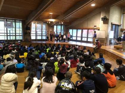 「朝のつどい」は,葛野小学校と一緒に行いました。山の家に宿泊している他の学校の子どもたちと合同で行い,お互いに,自分たちの学校を紹介しあいました。