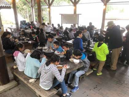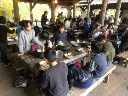 待ちに待った昼食です!みんなで作った「カレーライス」を食べました。どのグループもよい感じに盛り付けられています。