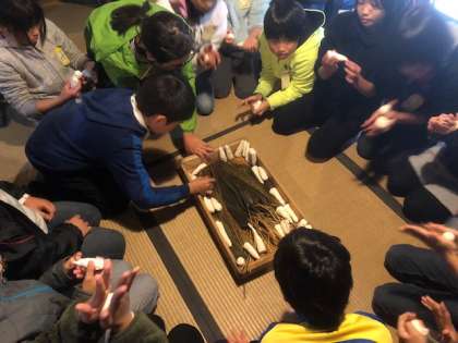 かやぶき屋根の北山民家の中で,ちまきを作っていると,雰囲気があります。研修室で作ることもあるのですが,写真のように昔ながら風景で作っているので,おいしさが増しているのではないかと思ってしまいます。
