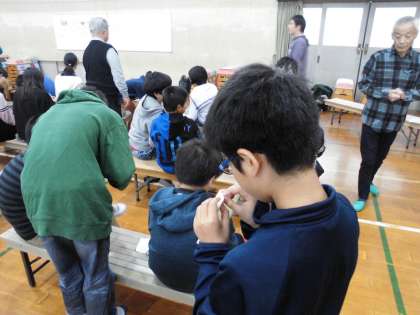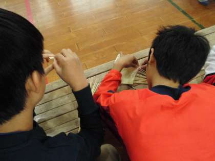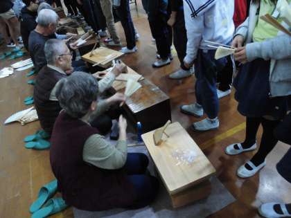 そして,いよいよ扇子作りの開始です。和紙に息を吹き込んで空間を作り,竹の先をできた空間に1本1本通していく作業を体験しました。これがとても緻密な作業で,子どもたちは苦戦しながらも一生懸命かつ楽しそうに作っていました。それが終われば,来校して頂いた職人さんの技術を駆使して完成です。