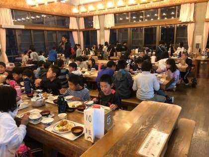 夕食のあとは,キャンプファイヤーです。みんなしっかりと食べて,エネルギーを補給しています。キャンプファイヤーでは,山にこだまするような元気な声が響いてきそうですね。