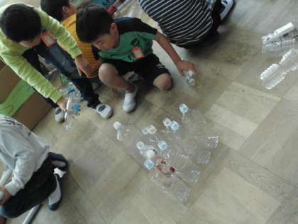 生活科の『あそんで ためして くふうして』の学習では身近なものを利用し,遊びや遊びに使うものを工夫して作る活動をしています。