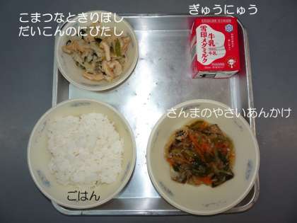 今日の給食は,『ごはん』,『さんまのやさいあんかけ』,『こまつなときりぼしだいこんのにびたし』『ぎゅうにゅう』です。
