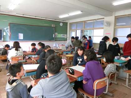 5年2組では,「ティッシュ落とすな」というゲームをすることになりました。受け付け・ルール説明・せん伝。ゲーム進行の係があります。今は係に分かれて準備を進めています。