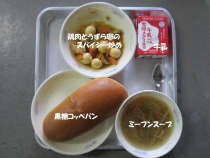 今日の献立は,『鶏肉とうずら卵のスパイシー炒め』『ミーフンスープ』『黒糖コッペパン』『牛乳』です。